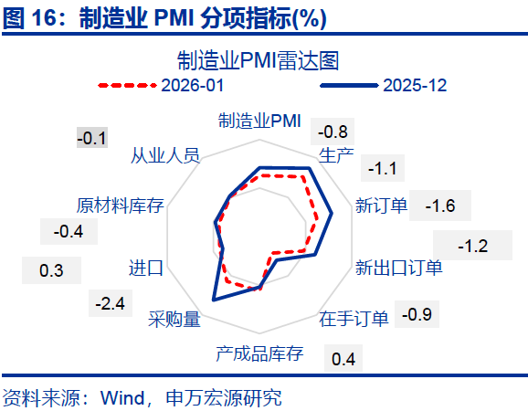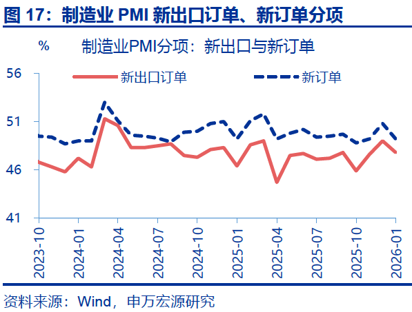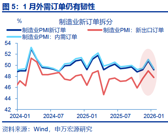 特征一:提前返乡对供给端压制明显,叠加内需表现偏弱,令制造业生产、新订单指数均有明显下滑。PMI统计对象是采购经理,虽然新订单统计包括中间需求,生产端走弱也会拖累新订单指数;但相对而言,提前返乡造成的供给侧走弱对生产端影响相对更大,观察1月PMI分项指数会发现,制造业采购指数回落幅度显著、较前月下行2.4个百分点至48.7%,拖累生产指数也有明显回落、较前月下行1.1个百分点至50.6%。新订单指数较前月下行1.6个百分点至49.2%,其中内需订单指数回落1.7个百分点至49.5%,而外需韧性下,新出口订单指数仅回落1.2个百分点至47.8%。