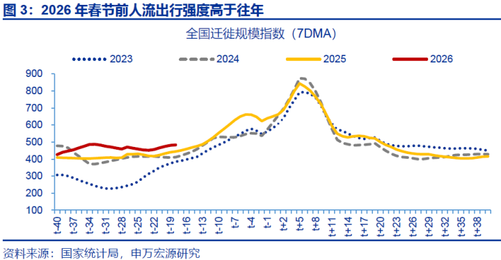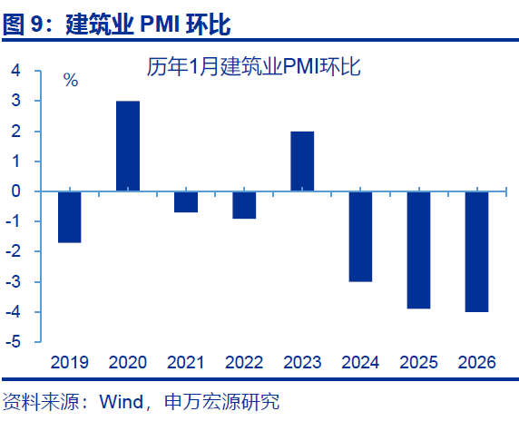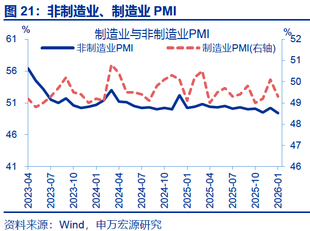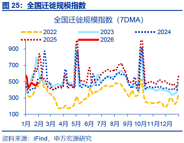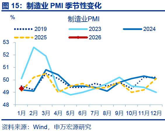 1月制造业PMI再度降至荣枯线以下,或与统计因素及春节返乡提前有关。1月,制造业PMI回落0.8个百分点至49.3%。一是PMI为环比指标,反映本月制造业景气度较上月的边际变化;因此2025年12月PMI冲高后,2026年1月PMI回落至50%以下为大概率事件。二是2025年12月中下旬以来,劳动密集型行业开工持续下行或使今年“返乡潮”提前,进而拖累制造业景气度;全国迁徙规模指数同比自4%上行至8.6%左右。