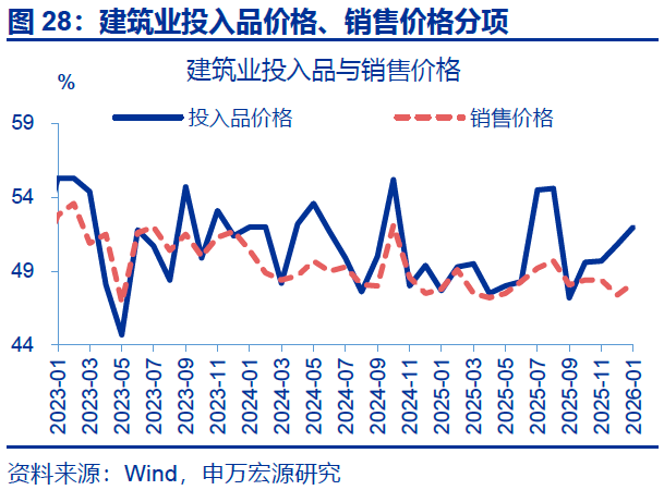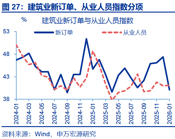 建筑业景气回落,新订单指数回落幅度较大。1月,建筑业分项中,新订单指数大幅回落,边际下行7.3个百分点至40.1%。从业人员指数有所回升,边际上行0.1个百分点至41.1%。投入品价格指数上行1.2个百分点至52.0%,销售品价格指数回升0.8个百分点至48.2%