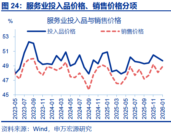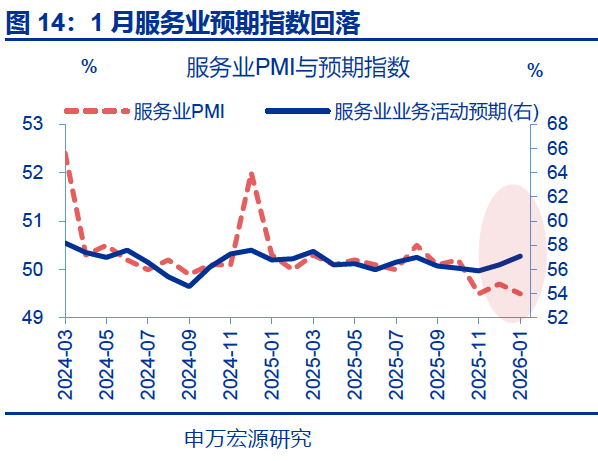 服务业PMI回落,新订单指数有所下行。1月,服务业PMI小幅回落,单月回落0.2个百分点至49.5%。主要分项中,新订单指数有所回落,较前月下行0.2个百分点至47.1%。