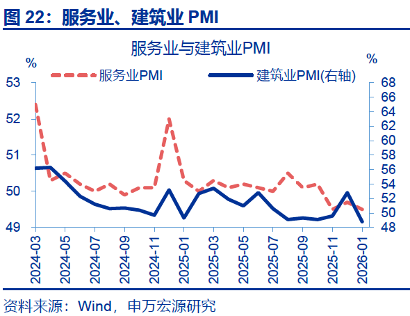 非制造业:非制造业PMI有所回落,主因建筑业PMI大幅回落。1月,非制造业PMI回落0.8个百分点至49.4%。其中建筑业PMI指数回落幅度较大,下行4.0个百分点至48.8%;服务业PMI小幅回落,单月回落0.2个百分点至49.5%。