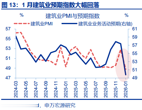 建筑业景气回落,新订单指数回落幅度较大。1月,建筑业PMI指数回落幅度较大,下行4.0个百分点至48.8%。分项中,新订单指数较前月下行7.3个百分点至40.1%。