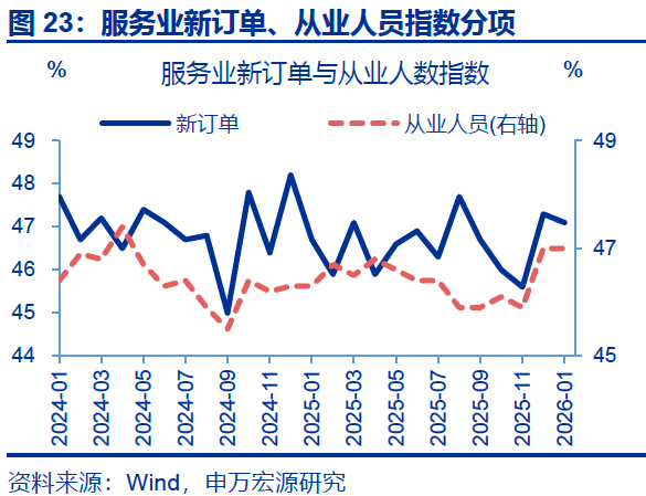 服务业中,新订单指数有所回落。1月,服务业主要分项中,新订单指数有所回落,较前月下行0.2个百分点至47.1%,从业人员指数持平前月(47.0%)。